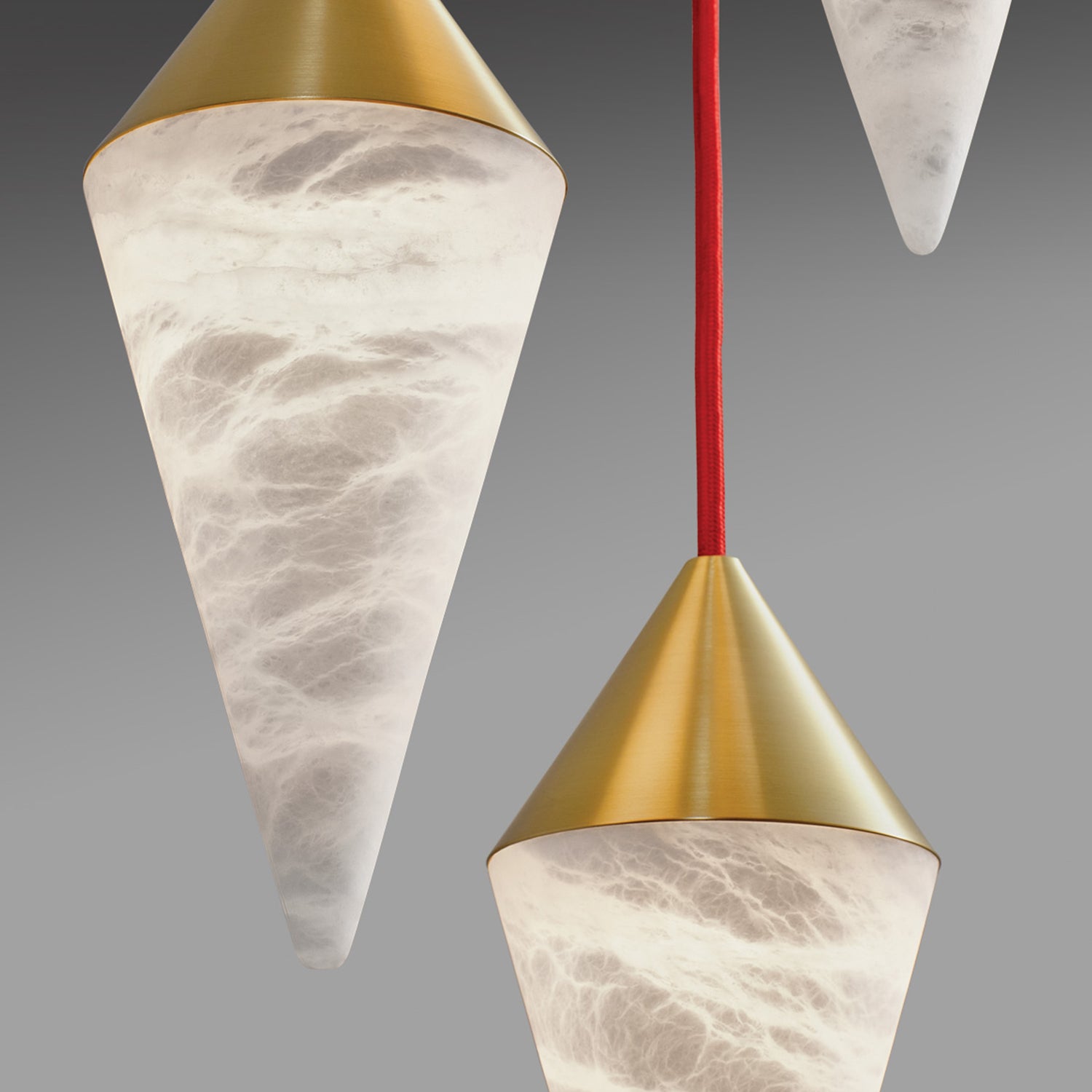 From a brass canopy, a group of textile cords drops down with sheer style. Brass cone shades dot the air with a timeless sleekness. Fitted below, alabaster cone shades bring a surge of texture through their natural veining.