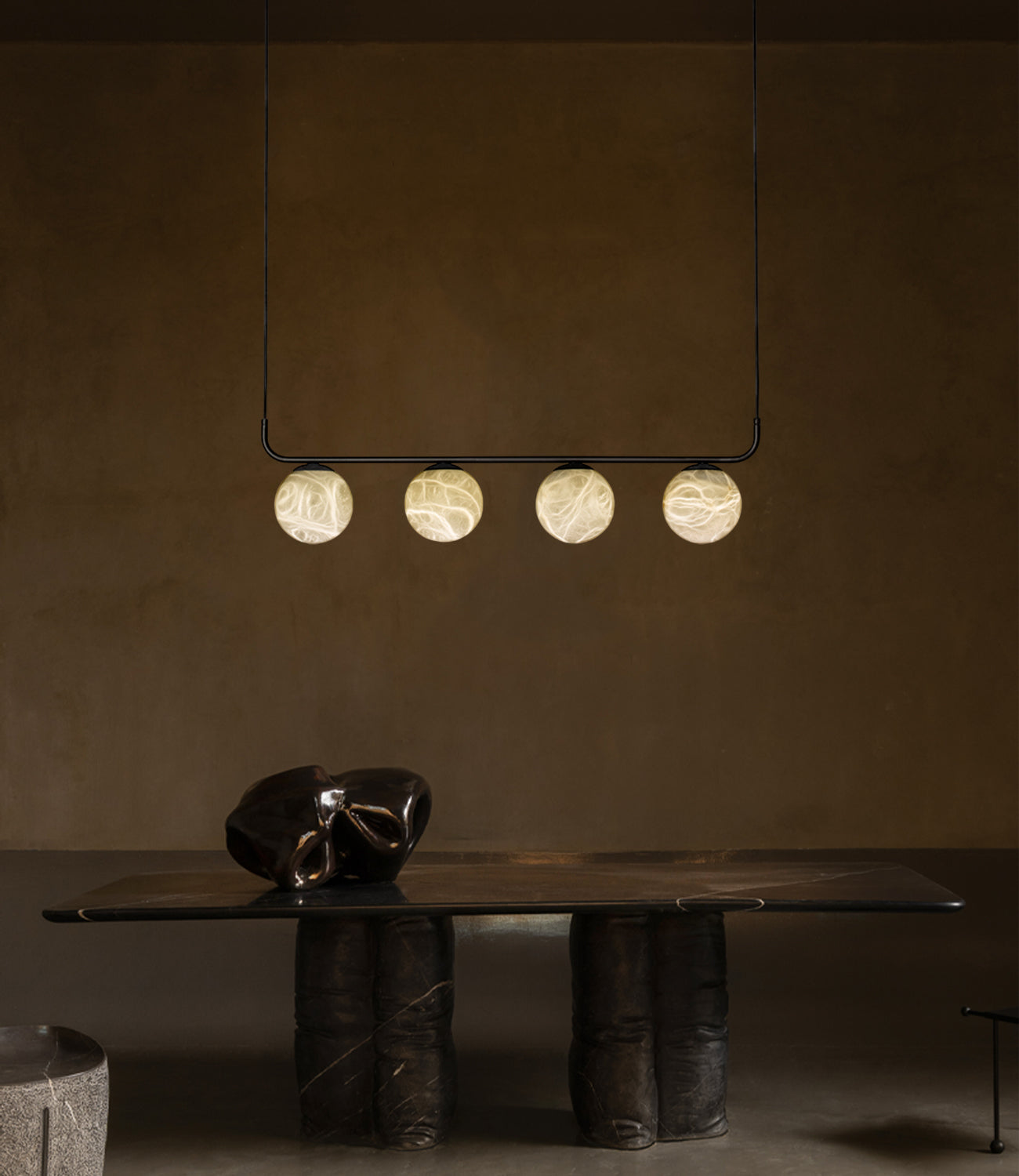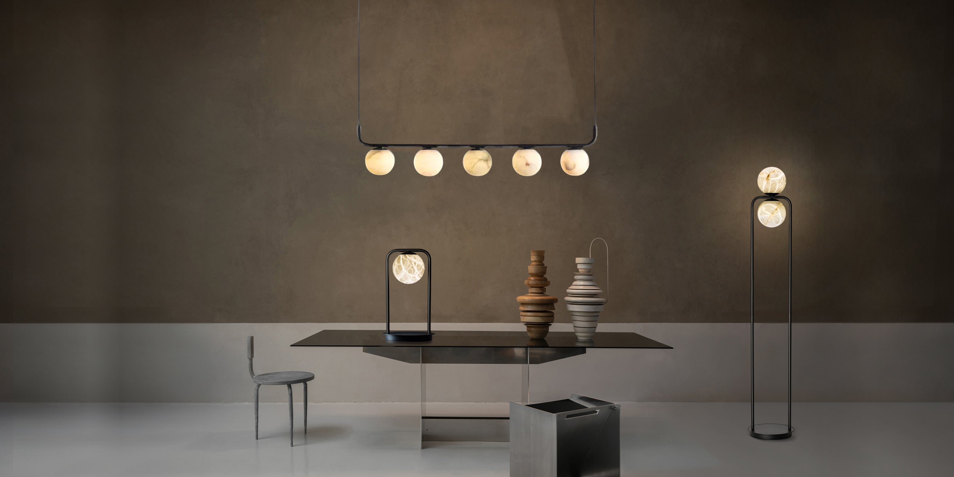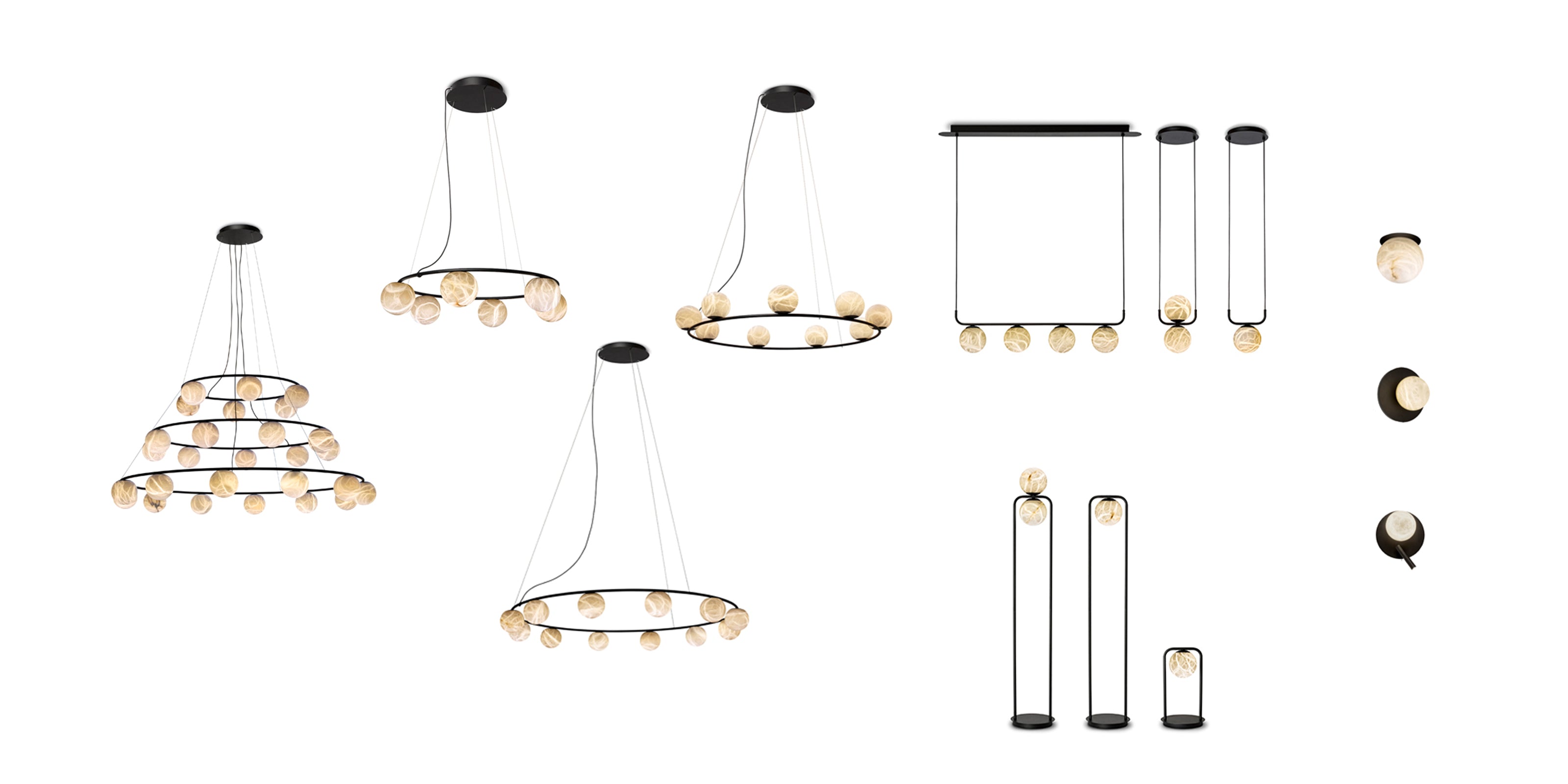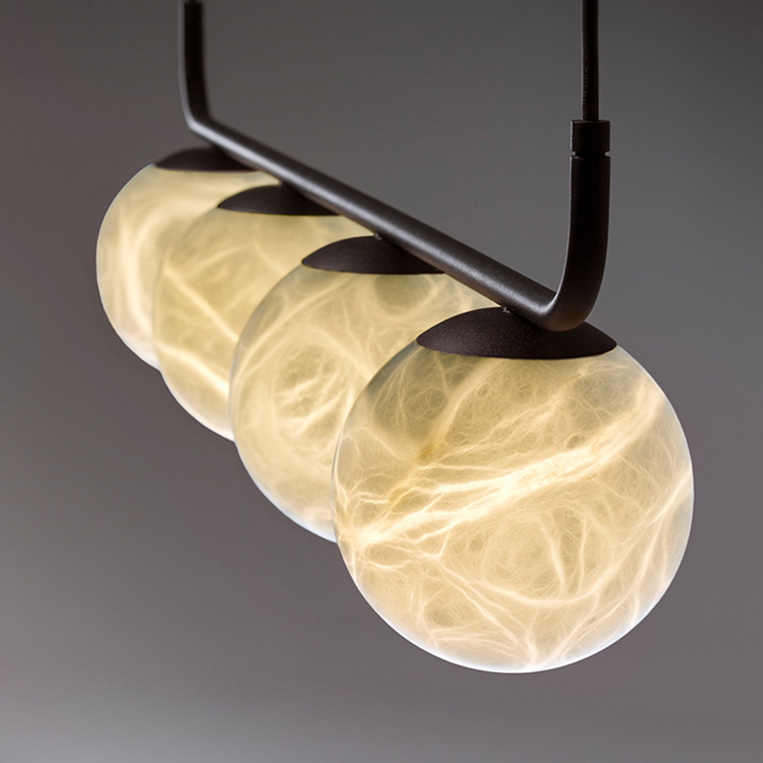 Illuminate your decor with the Chandelier, where antique black meets the celestial beauty of alabaster in a harmonious dance of luxury and sophistication. Carved from solid alabaster, its adjustable wires allow for custom compositions, enabling you to create a truly unique and captivating design.
