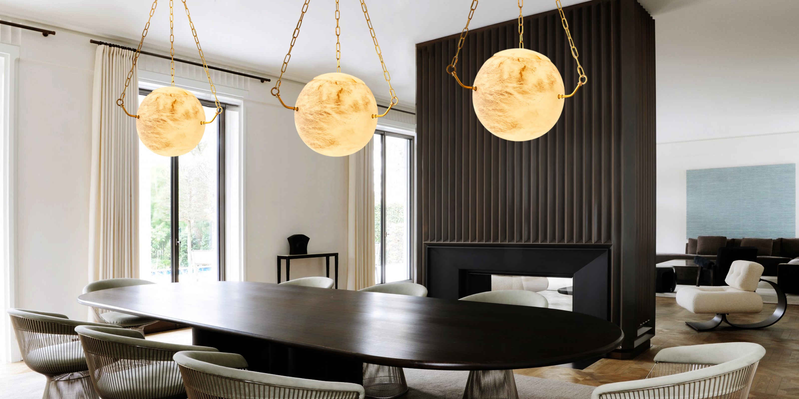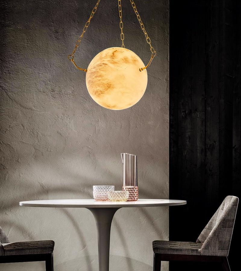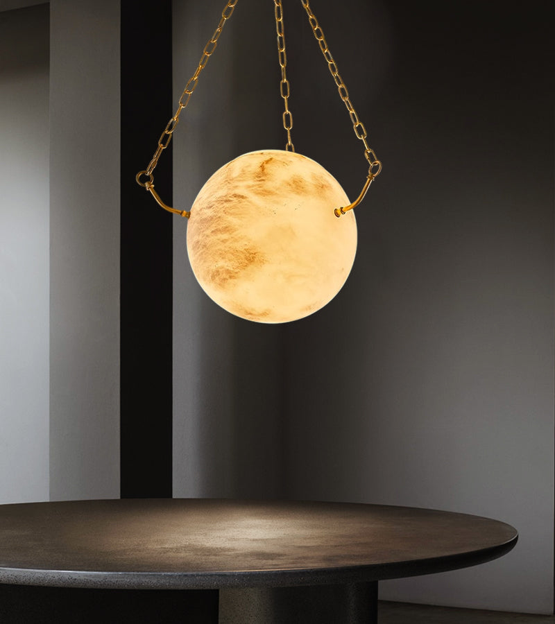 Crafted from premium Spanish alabaster and meticulously hand-polished into a smooth, spherical shade, this pendant light emits a soft, ambient glow, creating a warm and inviting atmosphere. Illuminate your home with timeless charm and effortless sophistication.