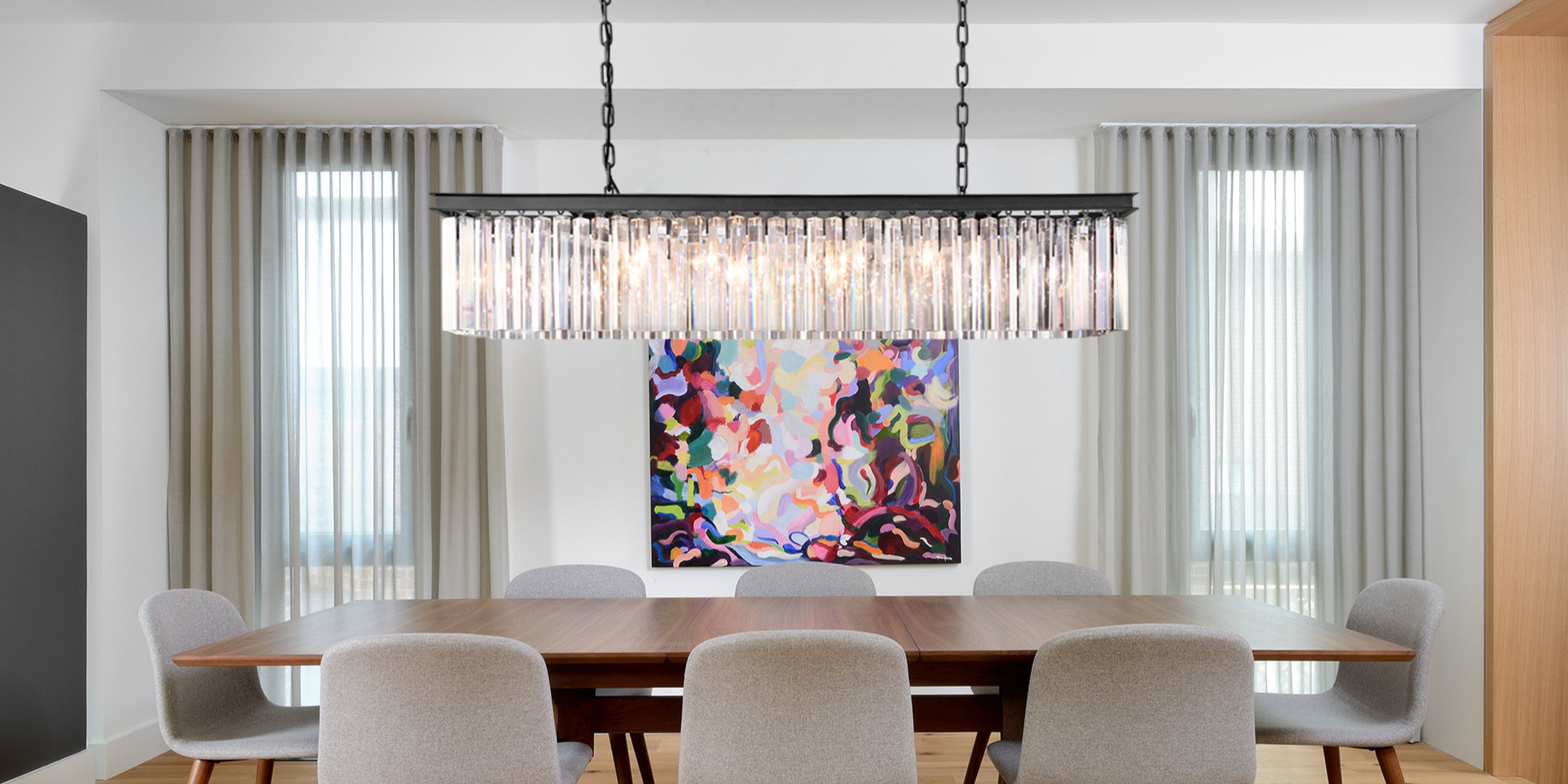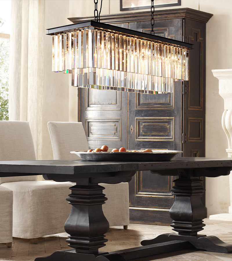 This rectangular crystal chandelier features an elegant black or gold frame that supports multiple crystals. The crystals reflect and refract light, creating a dazzling display of brilliance and beauty. This chandelier is perfect for enhancing the décor and comfort of your home, as it adds elegance and sparkle to any space.