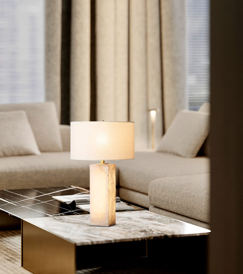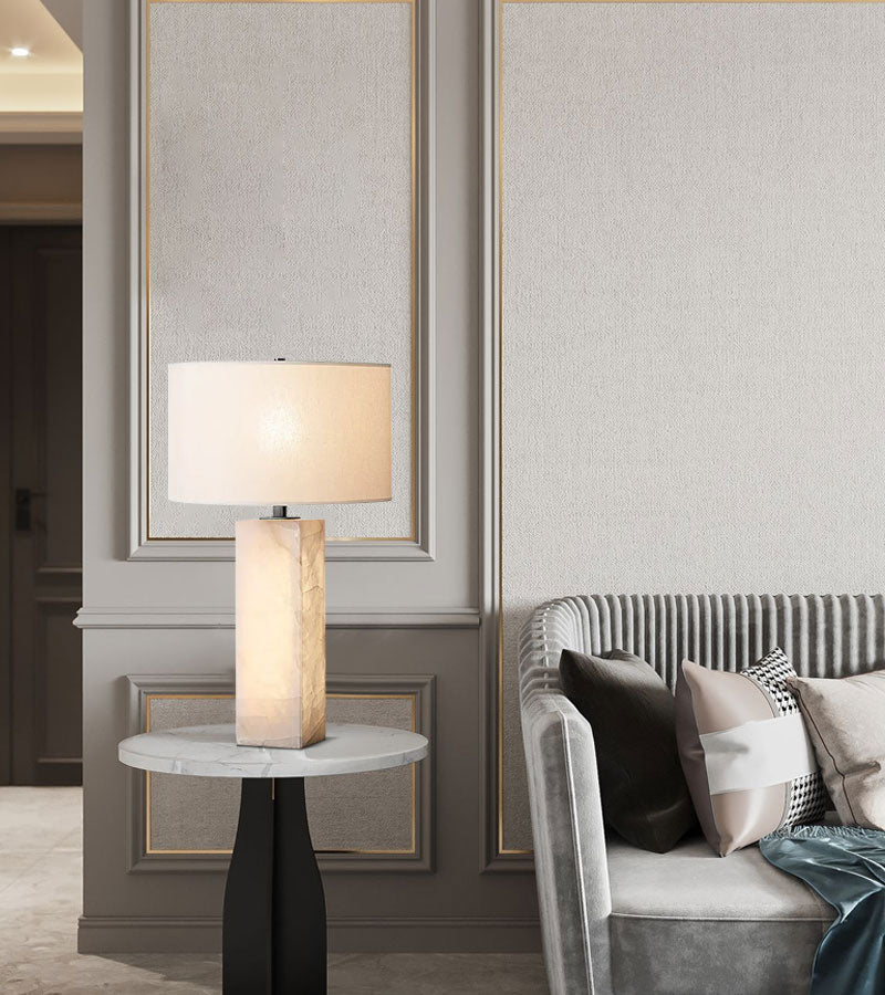 Vintage and Simple Alabaster Table Lamp crafted from the beauty of calcite stone and fabric lampshade, a translucent stone with a warm, natural glow. Polished sheets of stone are expertly pieced to create a smooth, continuous surface, while subtle illumination from within highlights the organic coloration and veining.