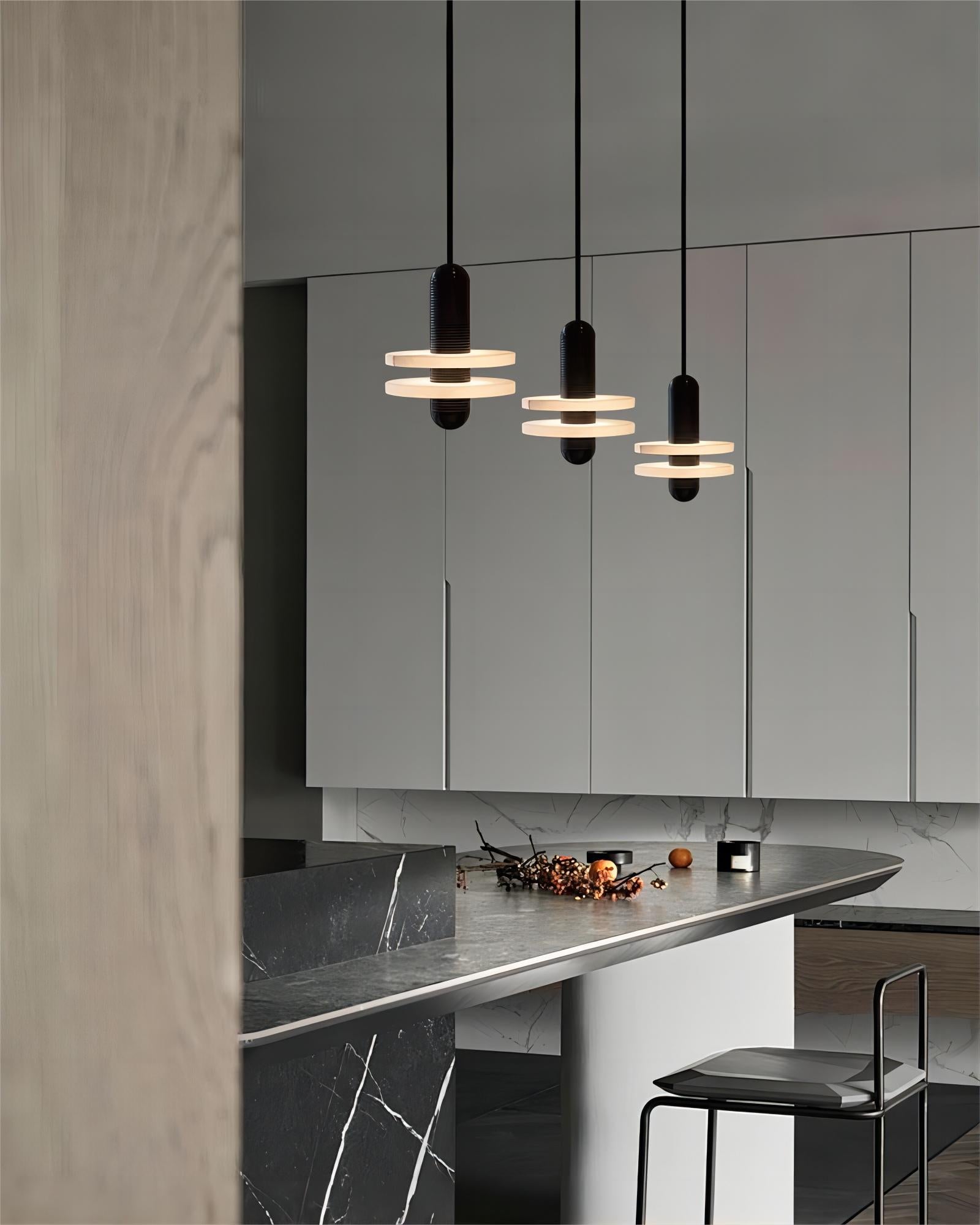 This modern Mable pendant light is made of iron and marble, referencing traditional Middle Eastern jewelry while pushing it through a futurist lens. The stone glows from a light source that remains hidden, illuminating the relationship between the solid and the permeable. Elevate your space with this luxurious and show stopping piece.