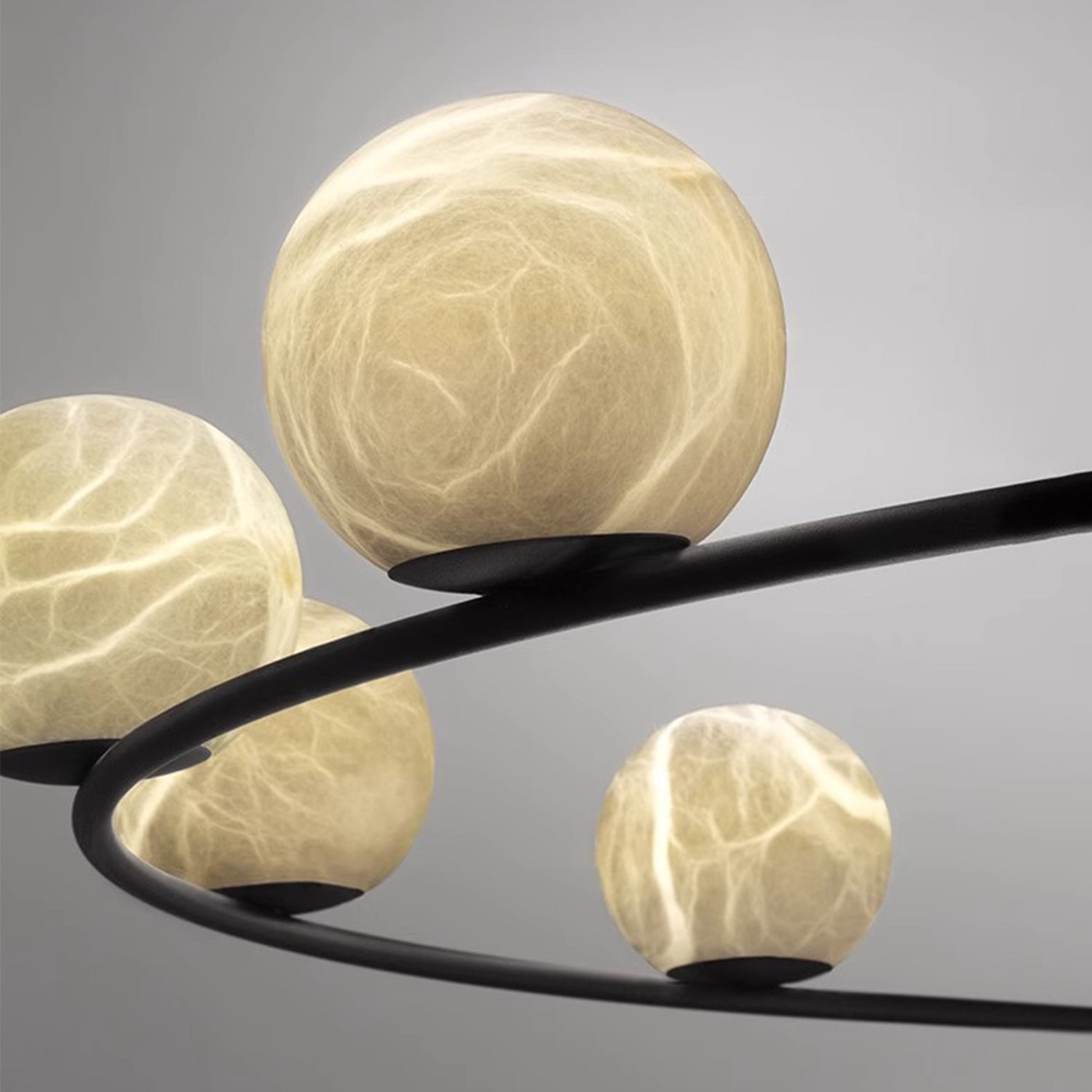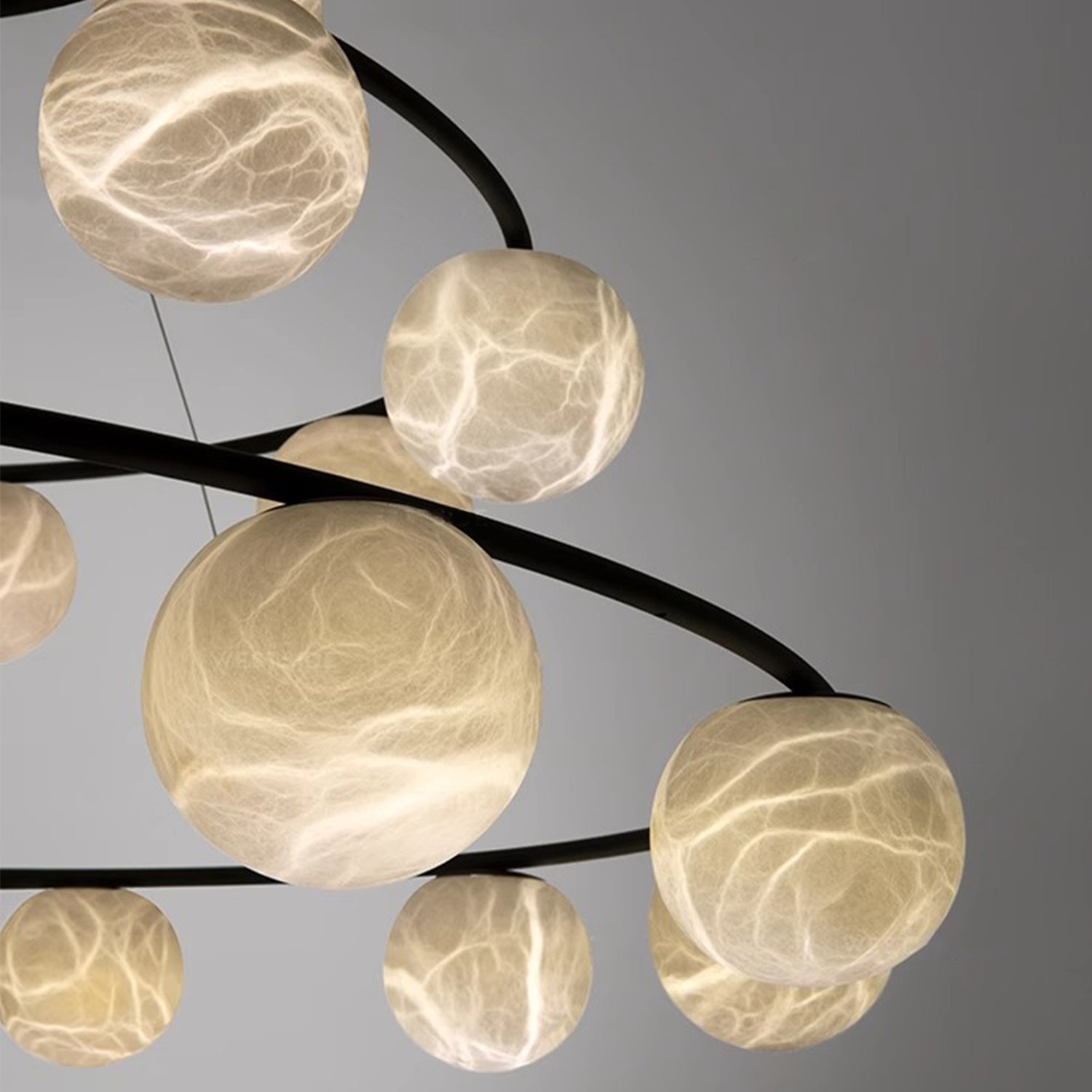 用这款枝形吊灯点亮您的家,古朴的黑色与雪花石膏的天籁之美交相辉映,奢华与精致和谐交融。吊灯采用实心雪花石膏雕刻而成,可调节的灯丝可根据您的需求定制组合,让您打造真正独特迷人的设计。