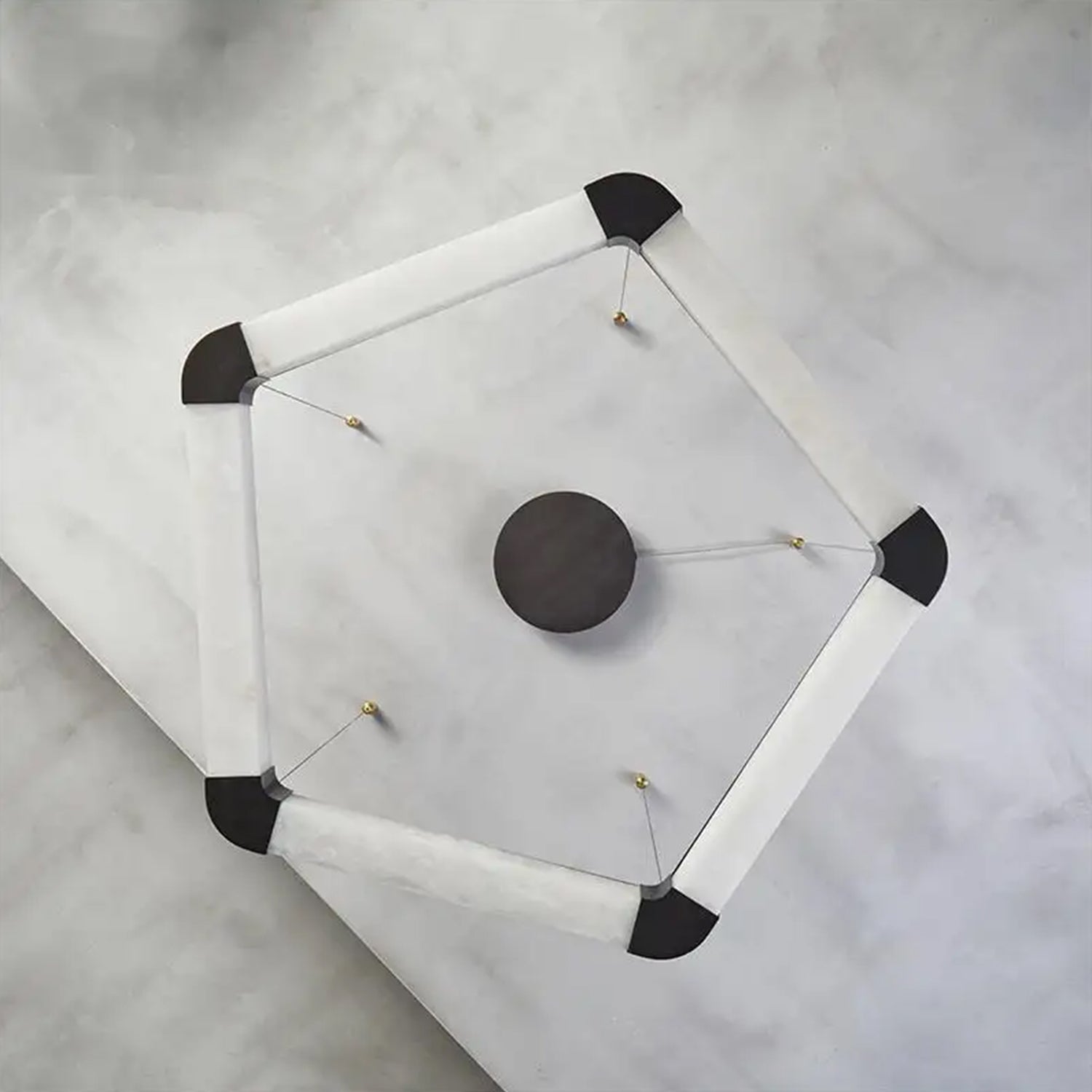 环形灯采用可调节的绳悬挂,呈五边形,由西班牙大理石和不锈钢角制成。