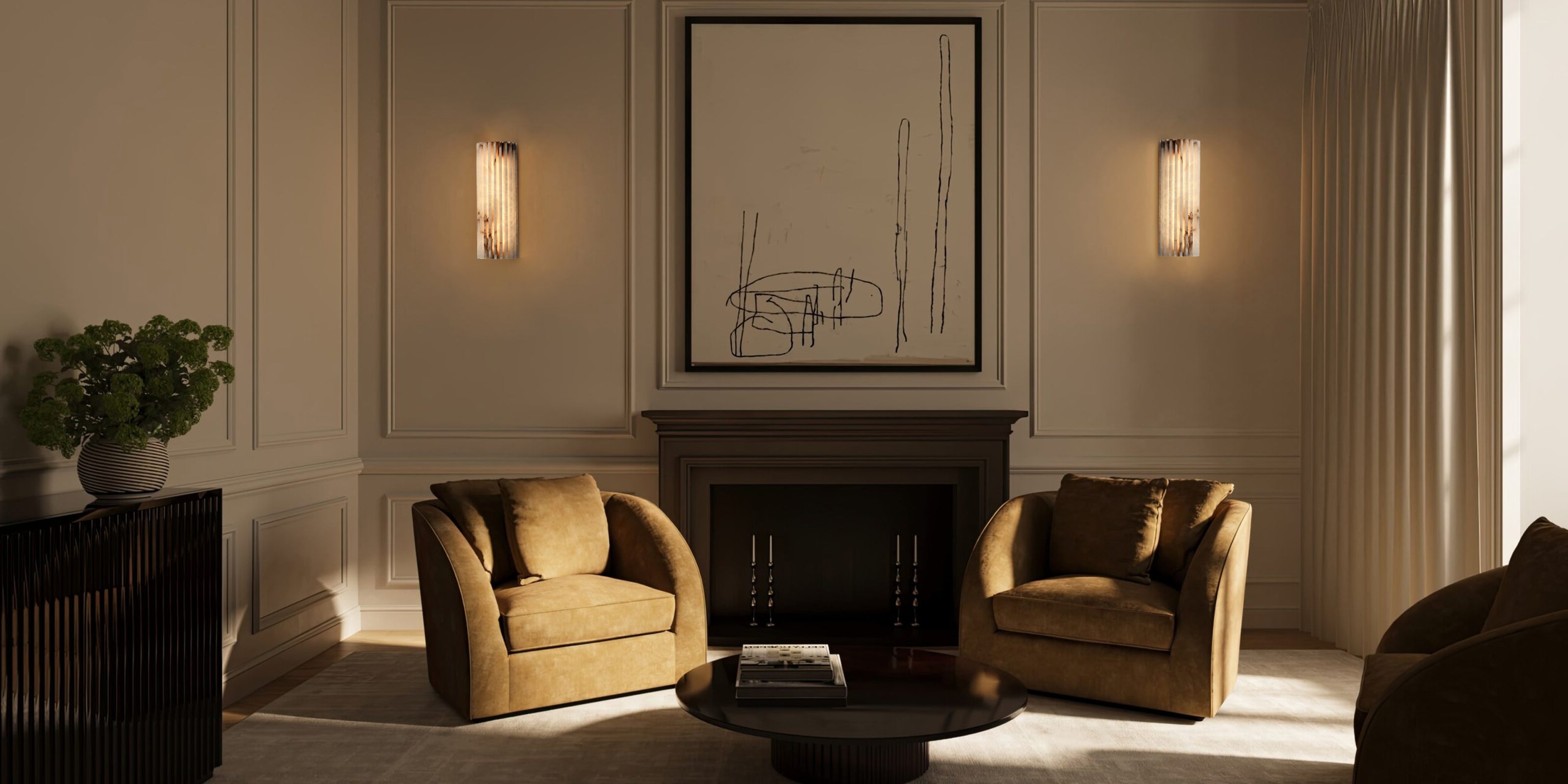 Hillside 壁灯将装饰艺术风格与自然质感完美融合。西班牙雪花石膏灯鳍片在点亮时散发出柔和的温暖,搭配抛光做旧黄铜背板。这款经典的墙面装饰单品,融合了飘逸的光泽和金属的精致质感。