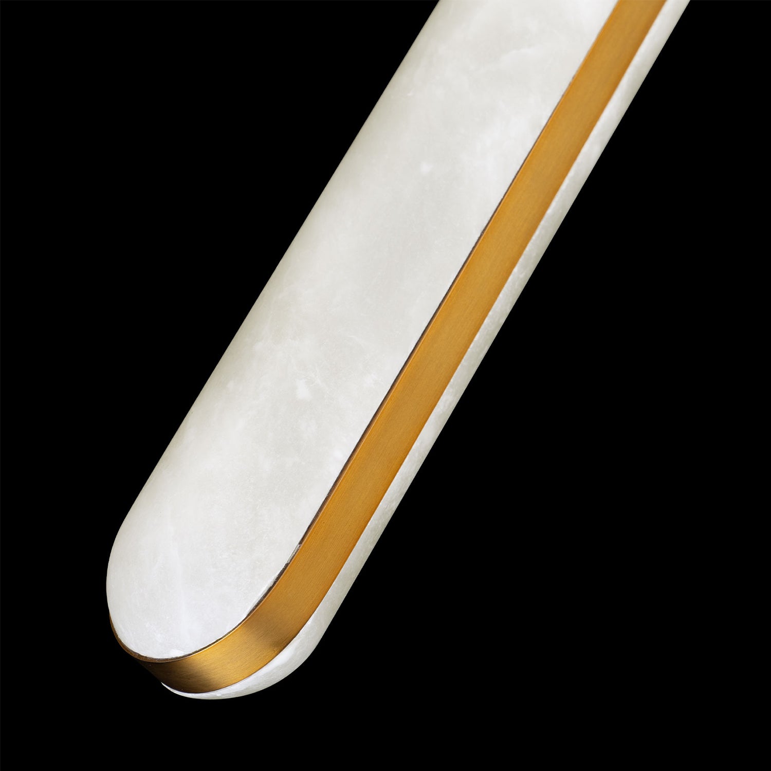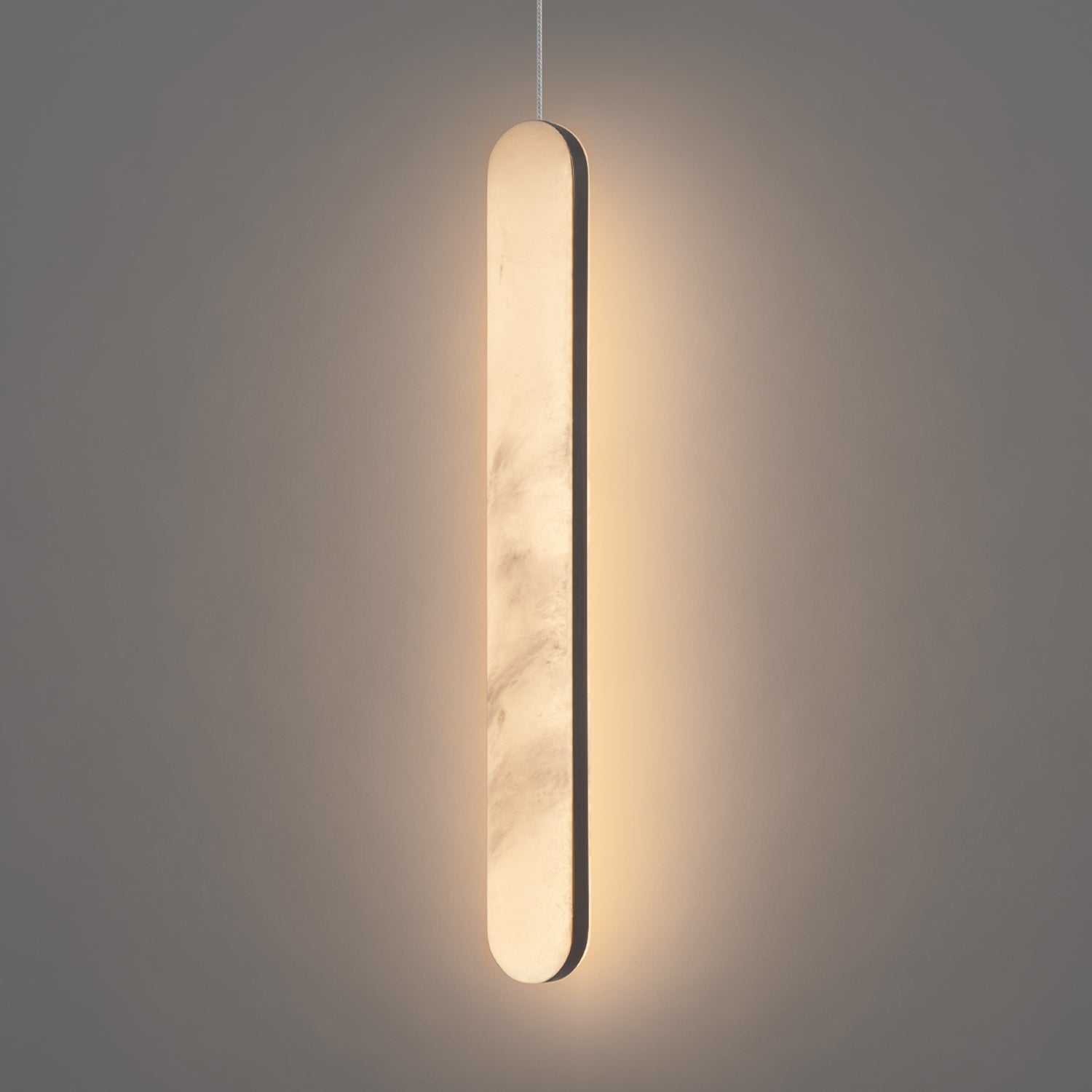 With their soft backlighting, these pendants are a powerful expression of alabaster’s mineral nature. The organic Cadiz pendant radiates a rich, luminous glow from a tall cylinder of Spanish Alabaster encased in slender metallic straps, showcasing the stone's distinctive natural patterns.