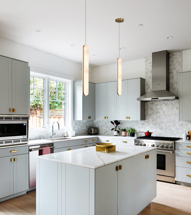 The organic Cadiz pendant radiates a rich, luminous glow from a tall cylinder of Spanish Alabaster encased in slender metallic straps, showcasing the stone's distinctive natural patterns. Its elongated design makes this pendant ideal for hanging in groups, adding a touch of elegance to any space.