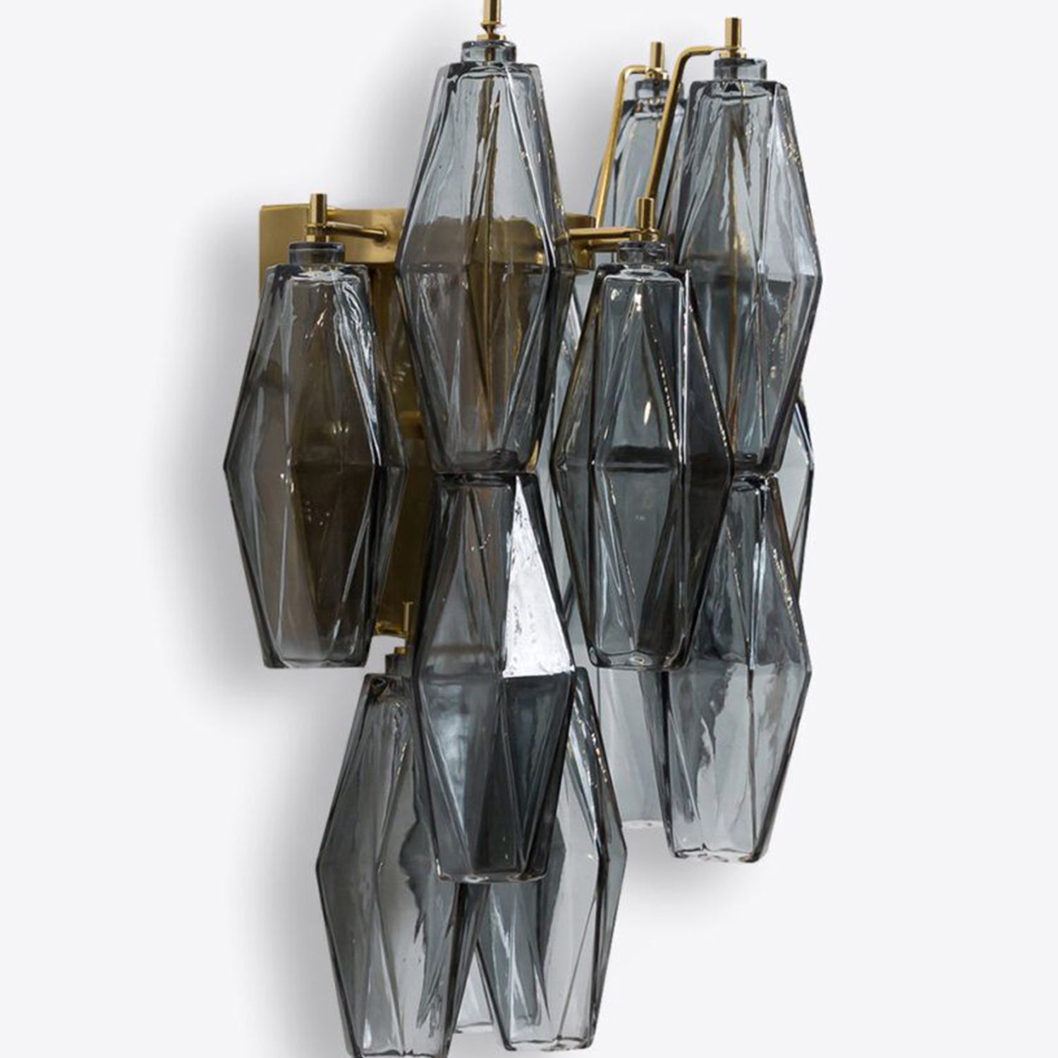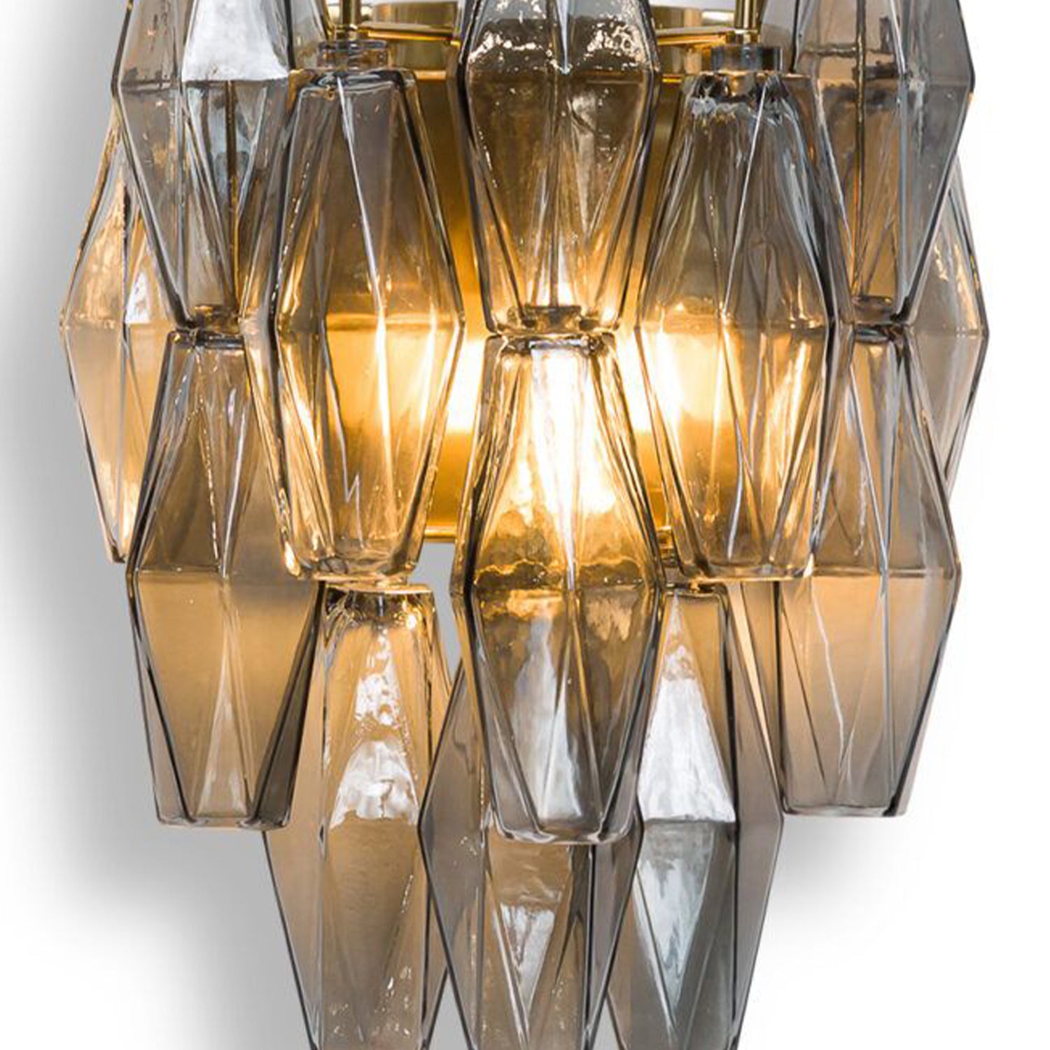 这款复古风格的壁灯由精美的彩色多面体玻璃构成,颜色包括粉色、琥珀色、淡紫色和烟熏色,并以醒目的钻石形状层叠排列。每块玻璃都单独用螺栓固定在黄铜框架上。