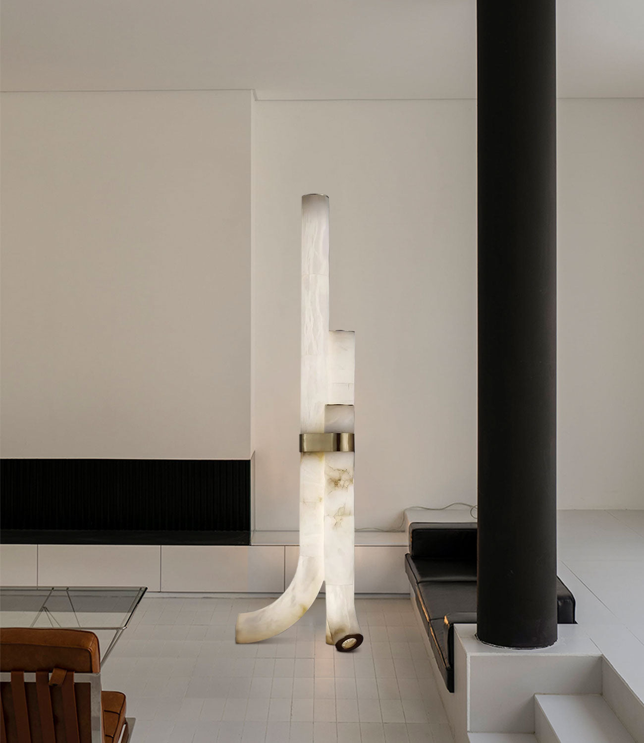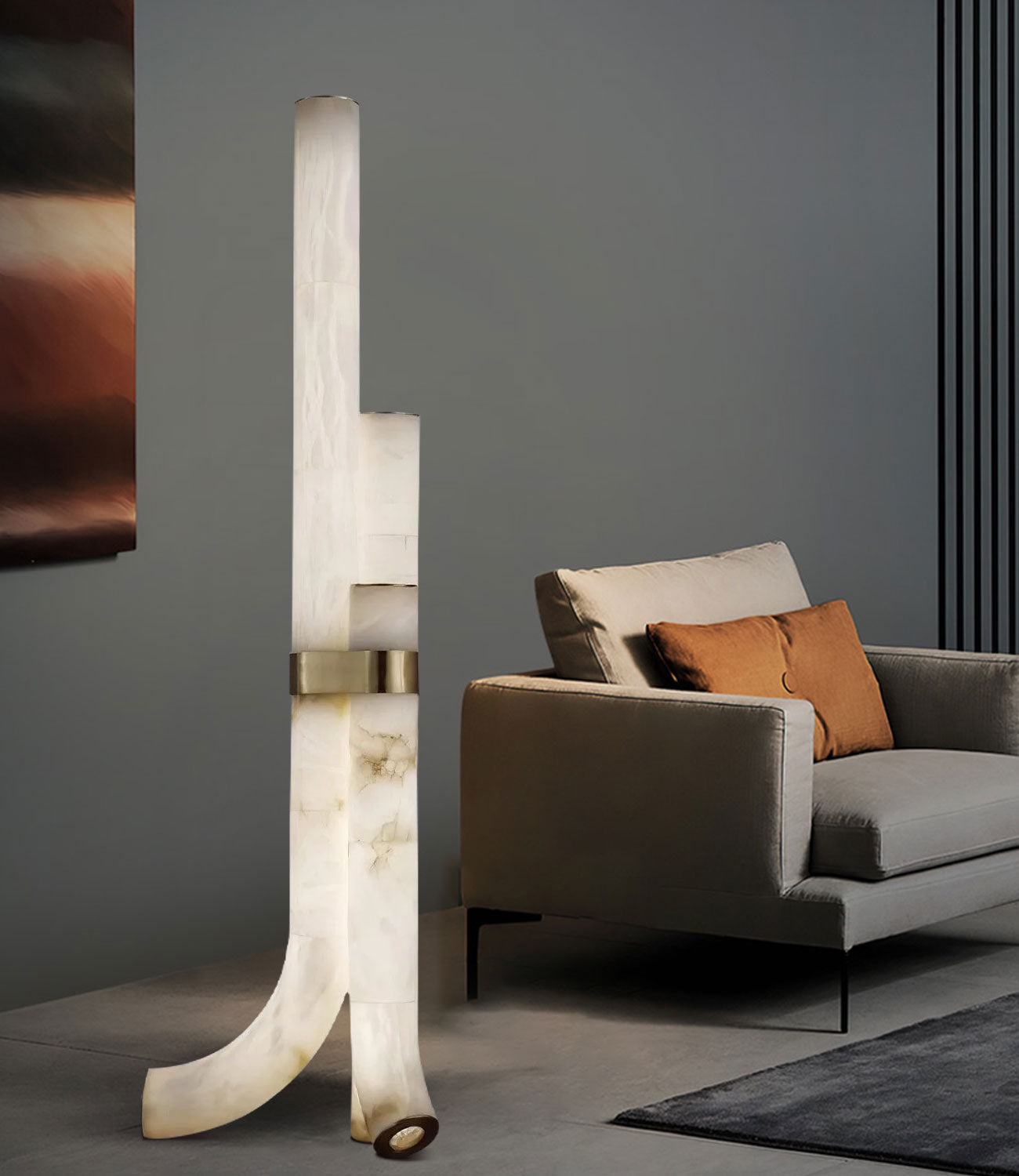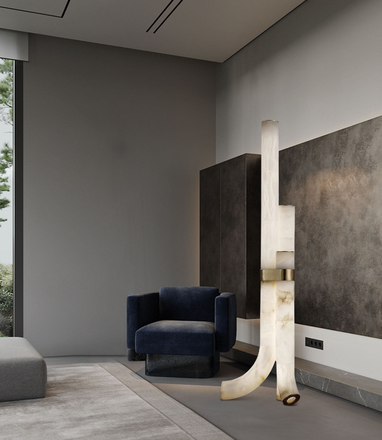 管状大理石落地灯展现现代简约的设计,三个管状大理石灯罩以独特的几何风格排列。沉醉于天然石材的魅力,温暖的光芒营造出优雅精致的氛围。