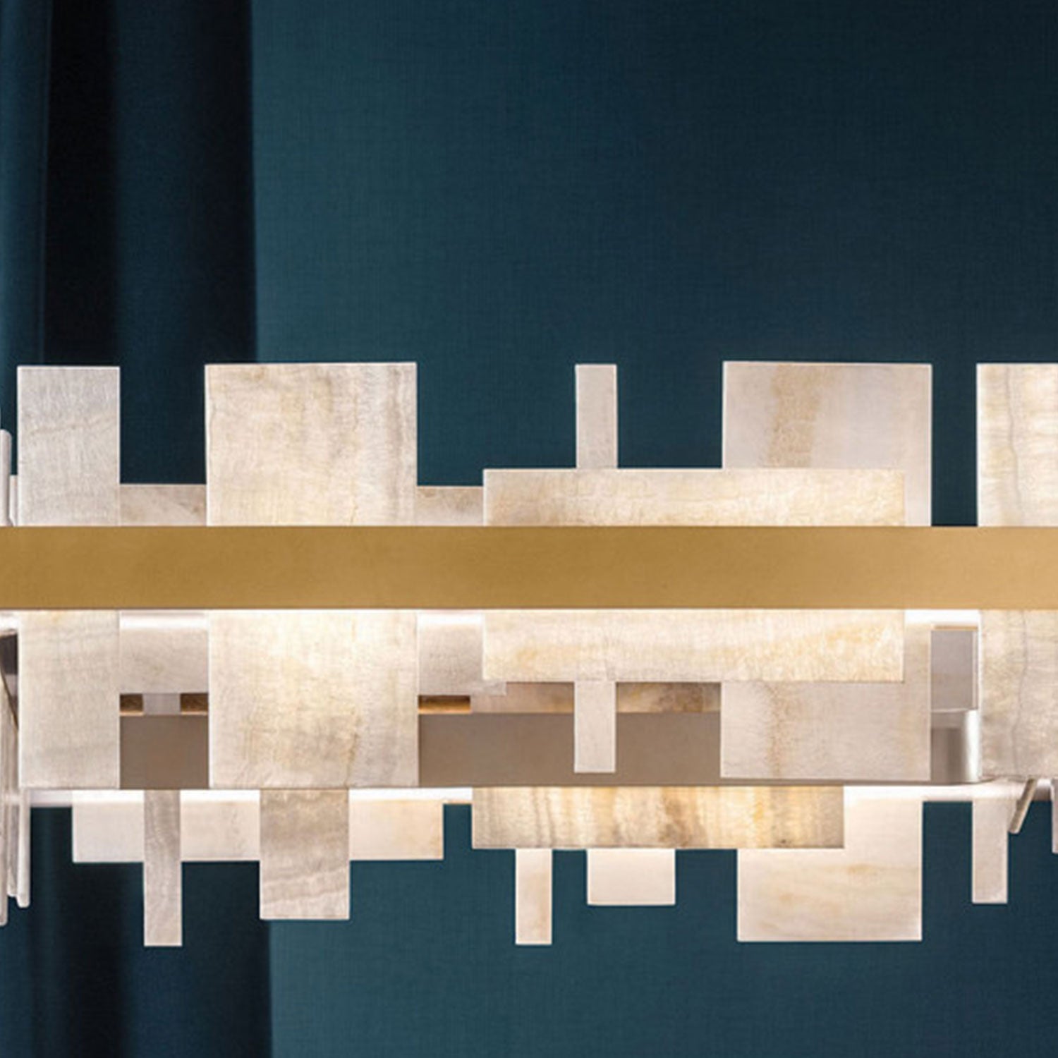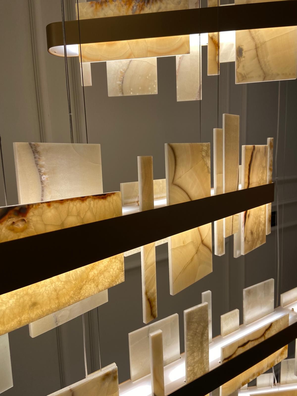该系列(包括吊灯和壁灯)采用不同尺寸的矩形天然云石扩散器,垂直和水平安装在金色饰面的方形不锈钢框架上。
