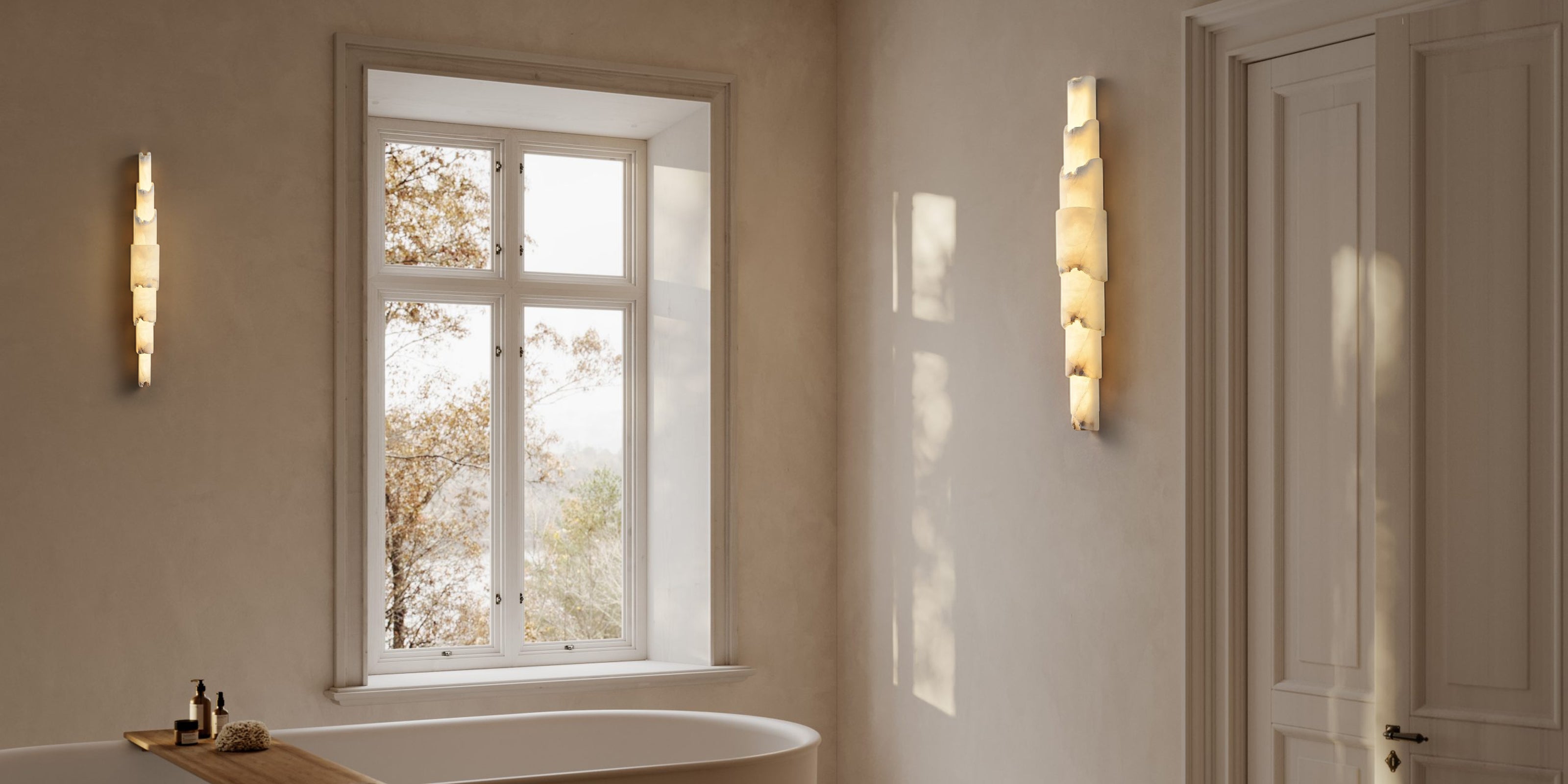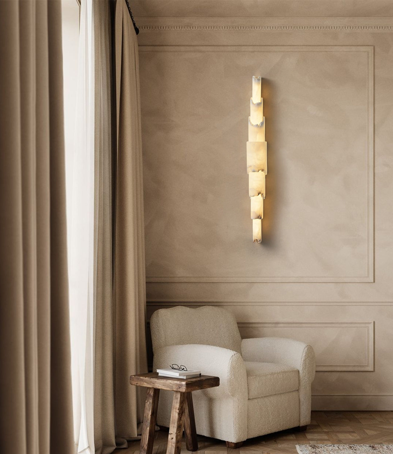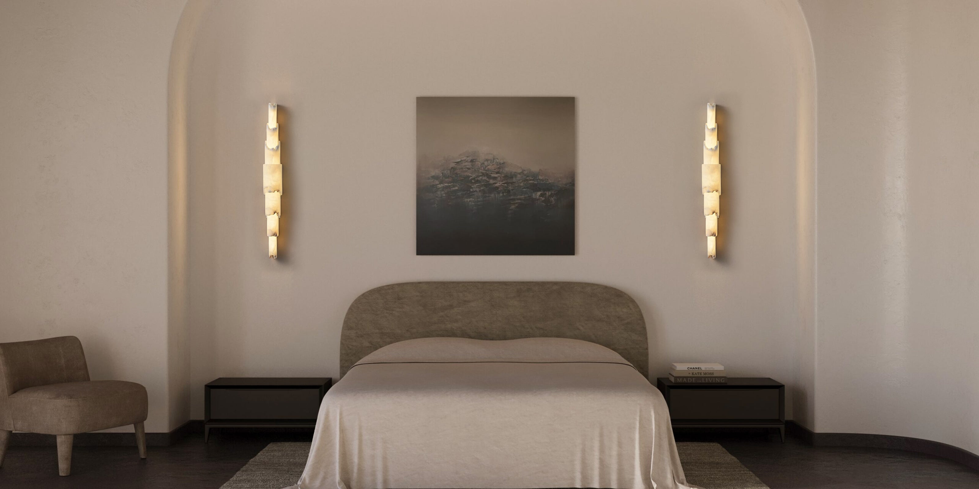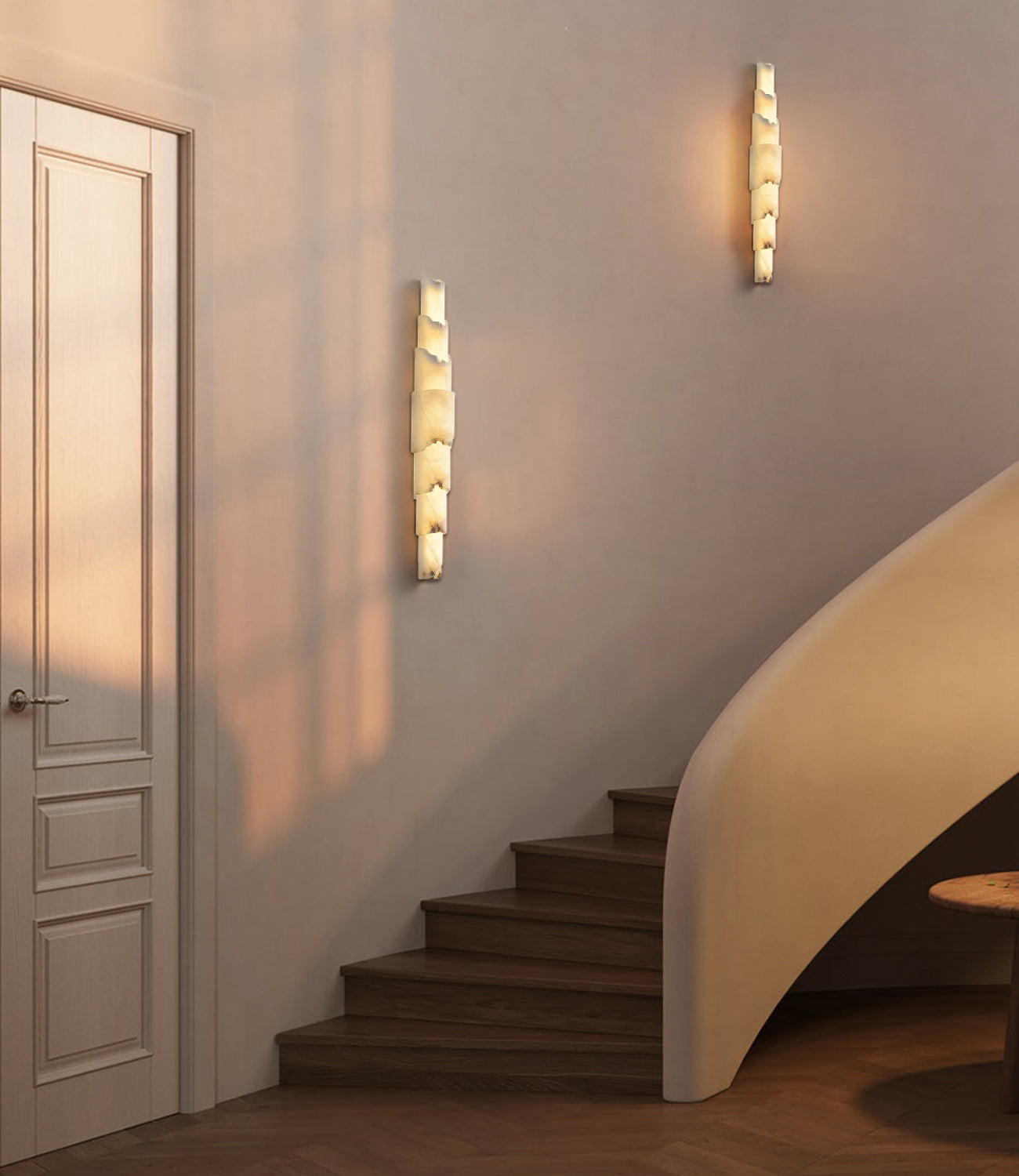 优雅的壁灯由黄铜背板和雪花石膏半圆柱体组成。每个壁灯内有多个光源,使石材的光照更加均匀。