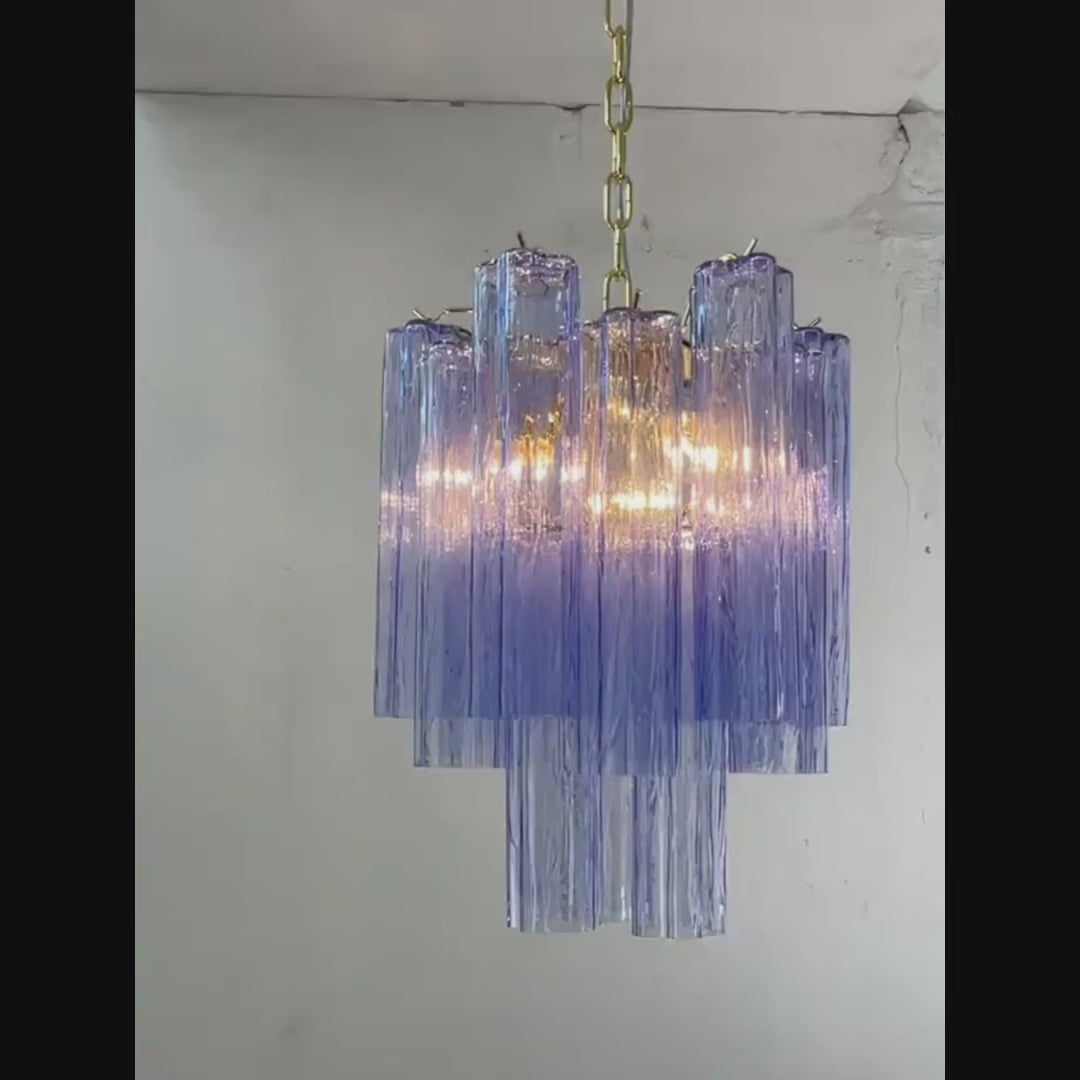 Elegant and commanding, the Murano Glass Chandelier adds a sculptural statement to any room. Handcrafted from Murano-inspired glass in a soft purple hue, each tier of rippled tubular elements cascades with light, creating mesmerizing depth and texture.
