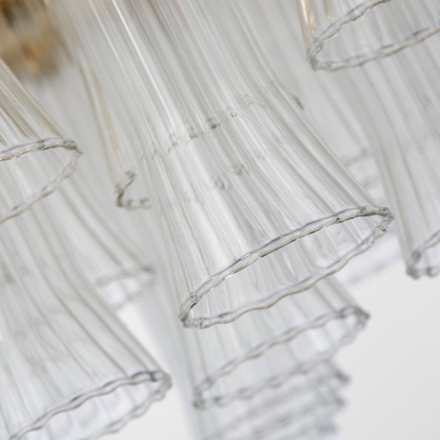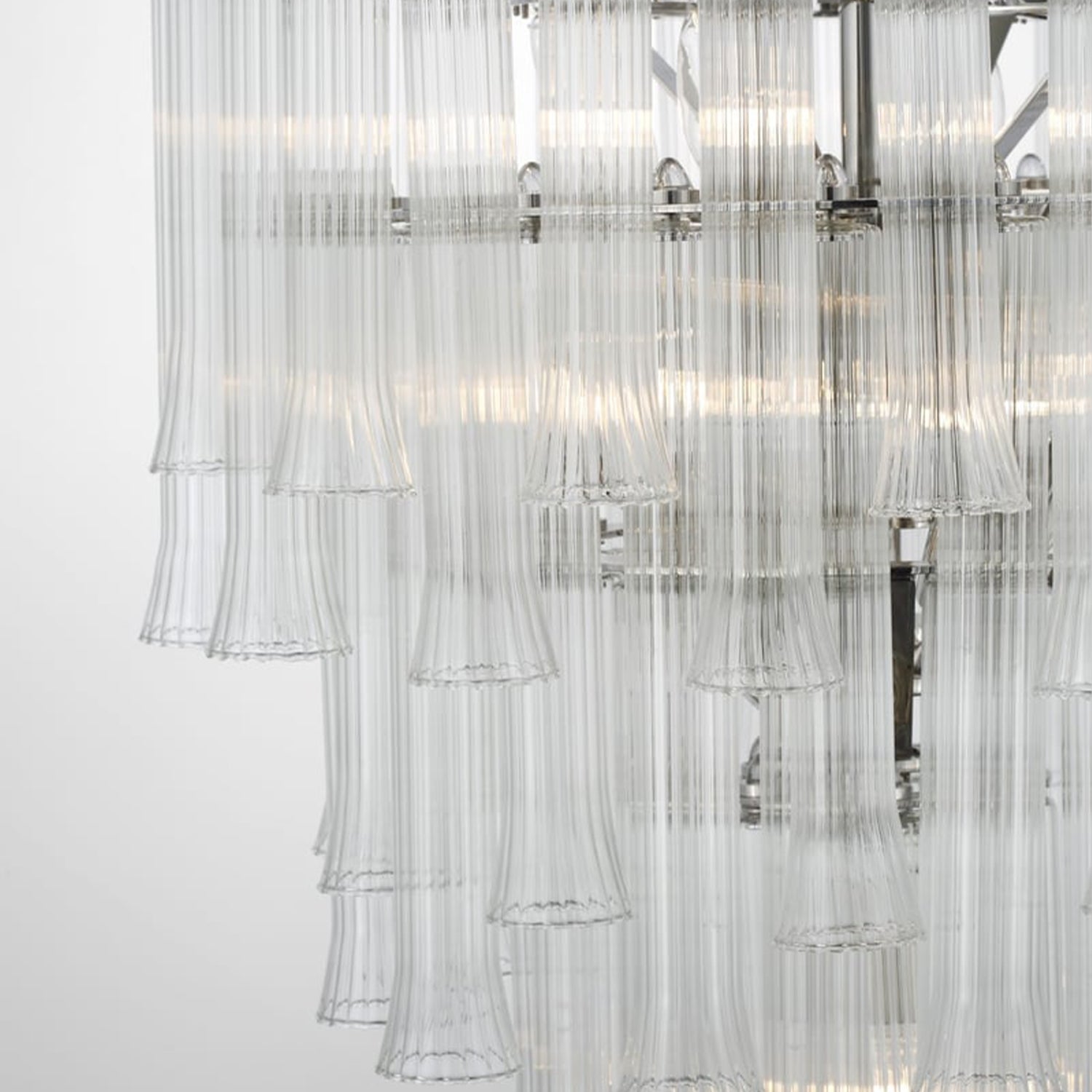 Elegant, fluted glass tubes cascade in concentric tiers, partially shielding a gleaming metal frame.This exquisite chandelier combines brilliant illumination with luxurious design, casting radiant highlights and a surrounding glow—perfect for elevating glamorous, high-end interiors.