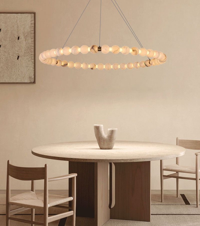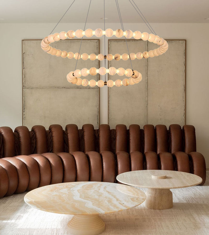 Expertly strung with lustrous Spanish Alabaster beads and draped over polished metallic arms, this chandelier transforms ceilings into ethereal focal points. Customize its cascading silhouette with varied stone textures and sizes, while hidden LEDs cast a whisper-soft glow to enchant any room.