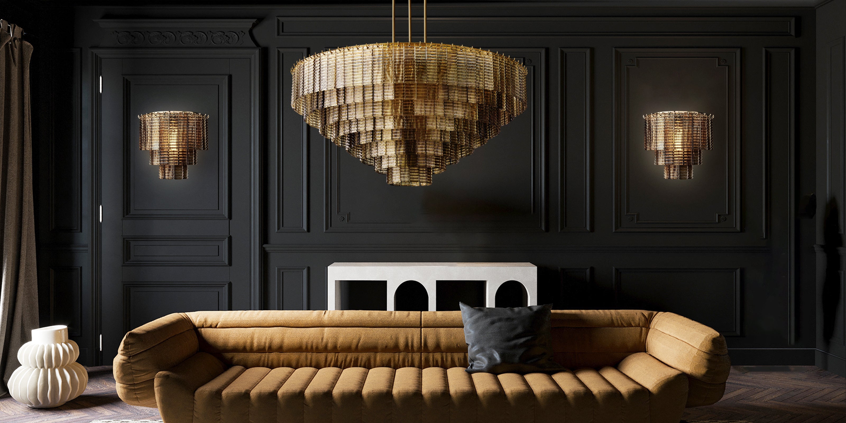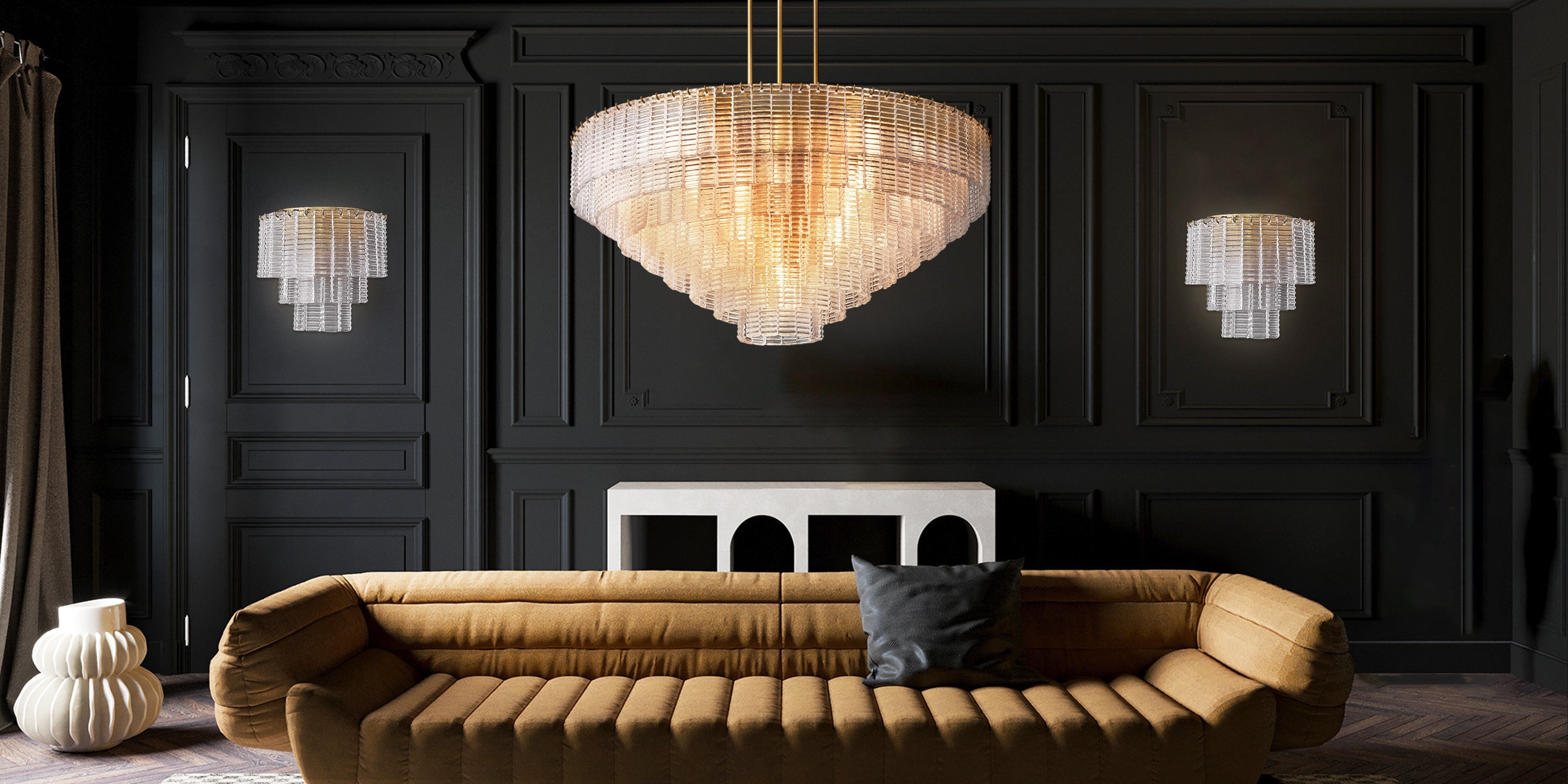该系列的枝形吊灯将传统玻璃工艺与现代风格巧妙融合。它以几何图案为灵感,以纹理丰富的铸造玻璃带为中心,以同心圆的形式层叠而下,散发出温暖的光芒,效果令人惊艳。