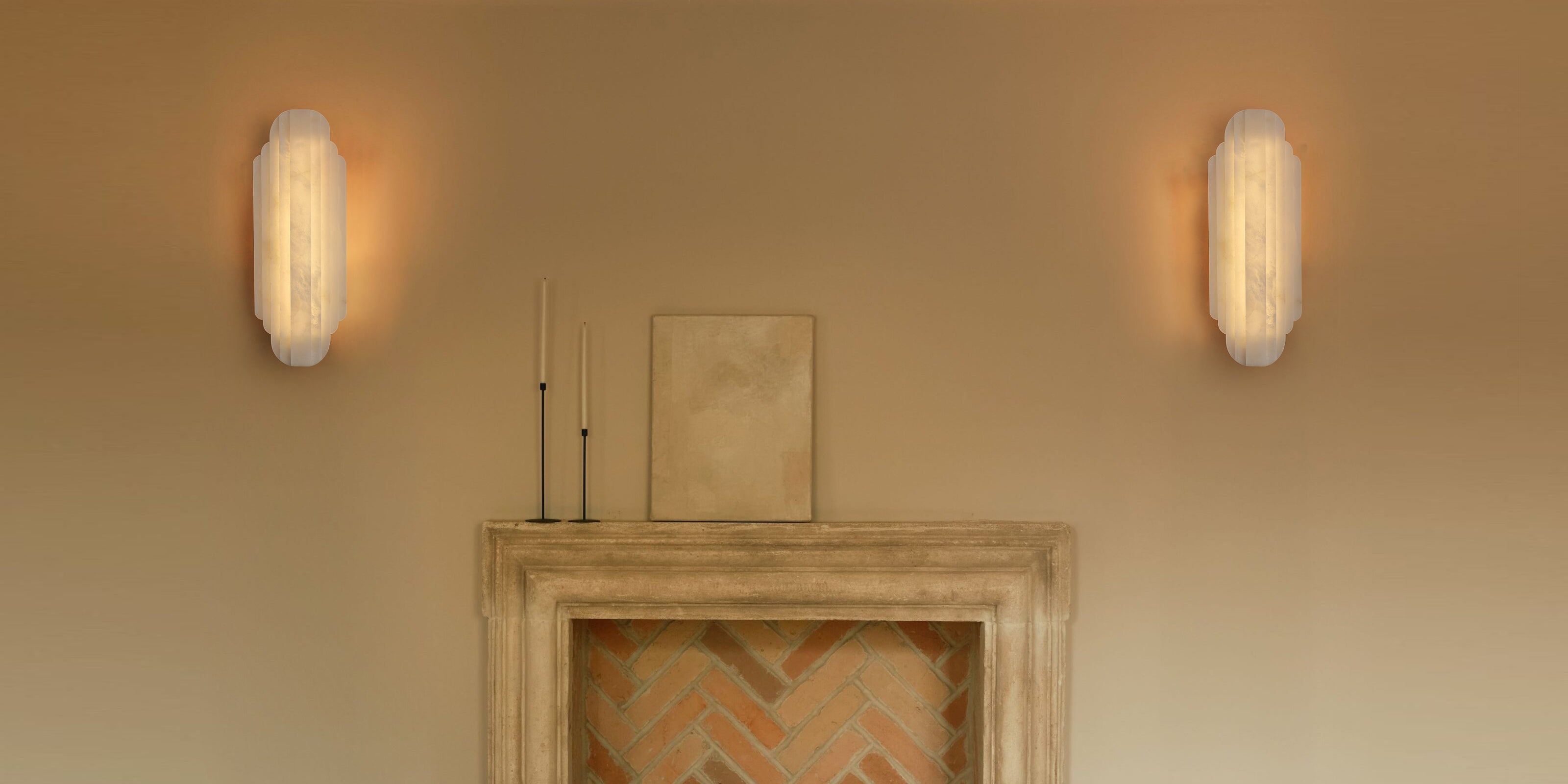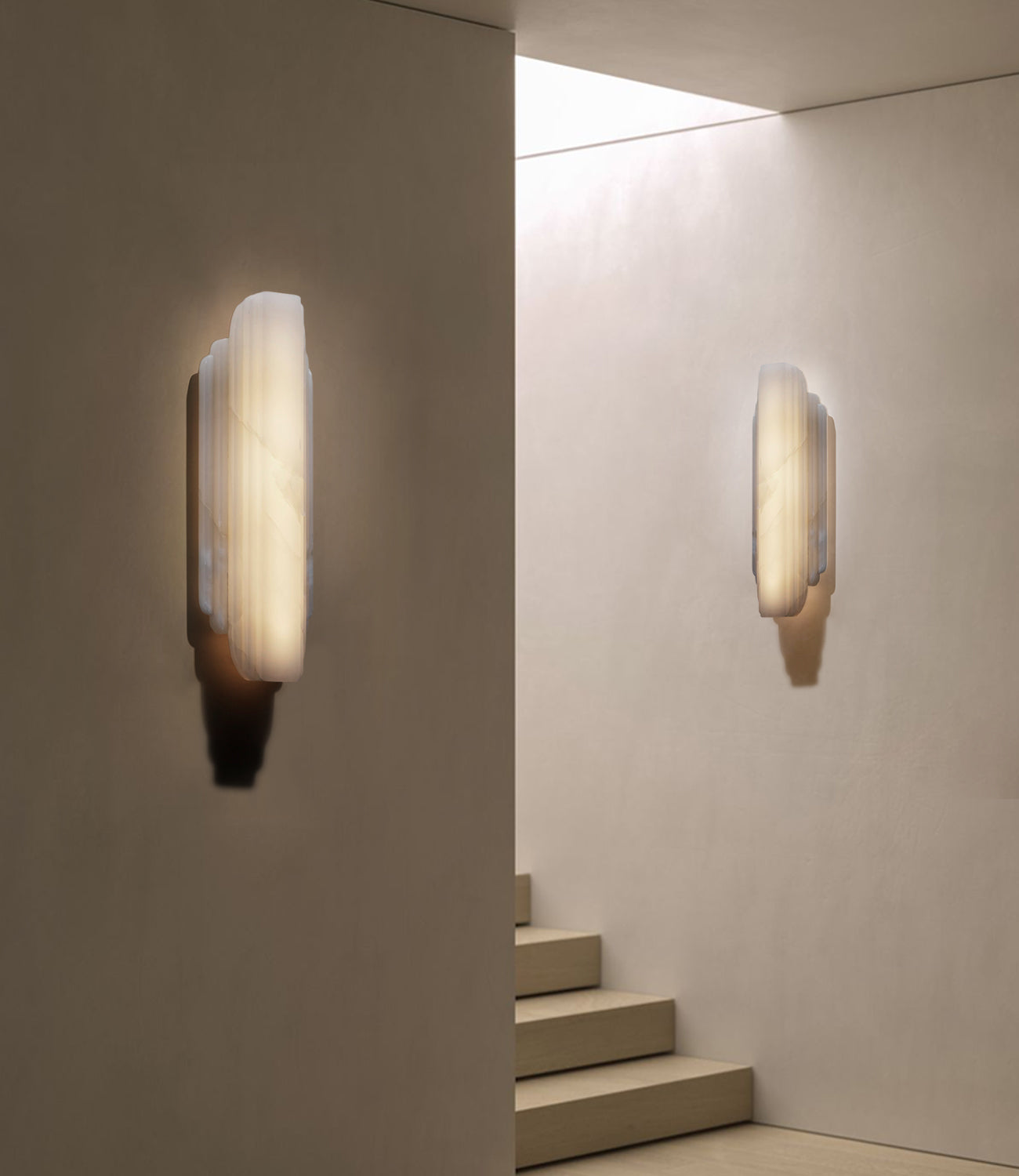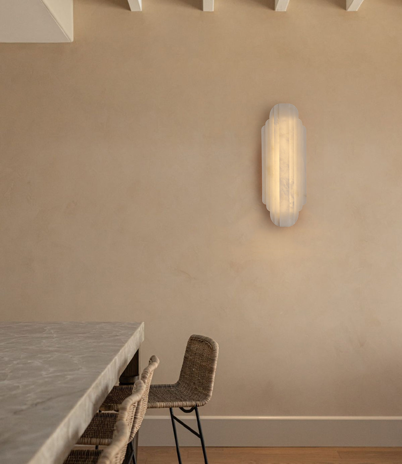 The Estelle Alabaster Wall Sconce exudes a quiet elegance and timeless charm. Its sophisticated alabaster shade, with its unique layered design, creates a warm, diffused glow that gently illuminates the surroundings.