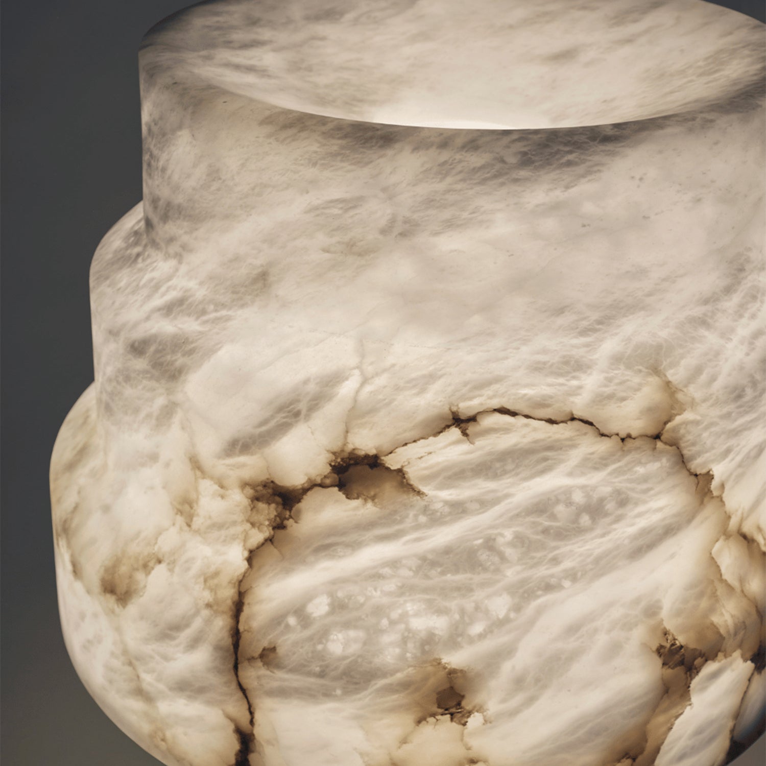 A laud to the beauty of natural stone, its features a pillar of natural alabaster rises in stacked sections to form a uniform base and shade.